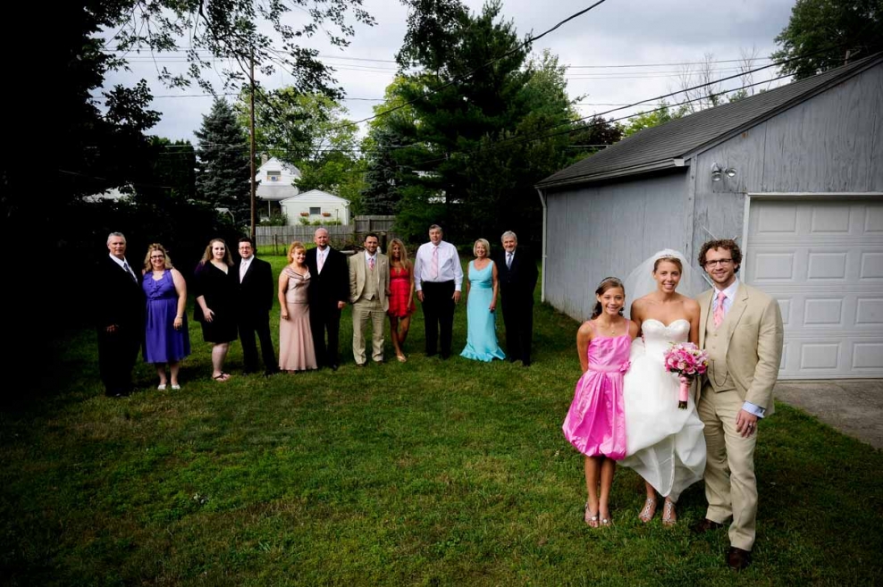 This image is from a couple of years ago, from Michelle and Mike’s wedding. After the ceremony, we had a lot of time to kill before heading to the reception so we went to their house to hang out for a while. A few friends and relatives came along with us and we decided that we’d do a group portrait in the backyard. This first picture is the group shot: