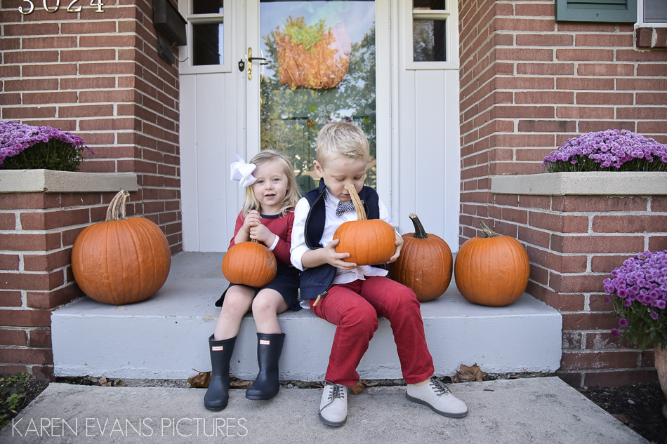 It’s that time of year again: colorful leaves, pumpkins, and family photos at the Robertson’s! We lucked out with unseasonably warm weather for our annual fall shoot this year, and the kids were totally in the mood for pictures, so it was a fabulous morning to play on the swingset and run around in the yard. Then it was into the house and the jammies for Christmas-themed pictures with Millie, who reluctantly, but patiently, wore her new antlers.